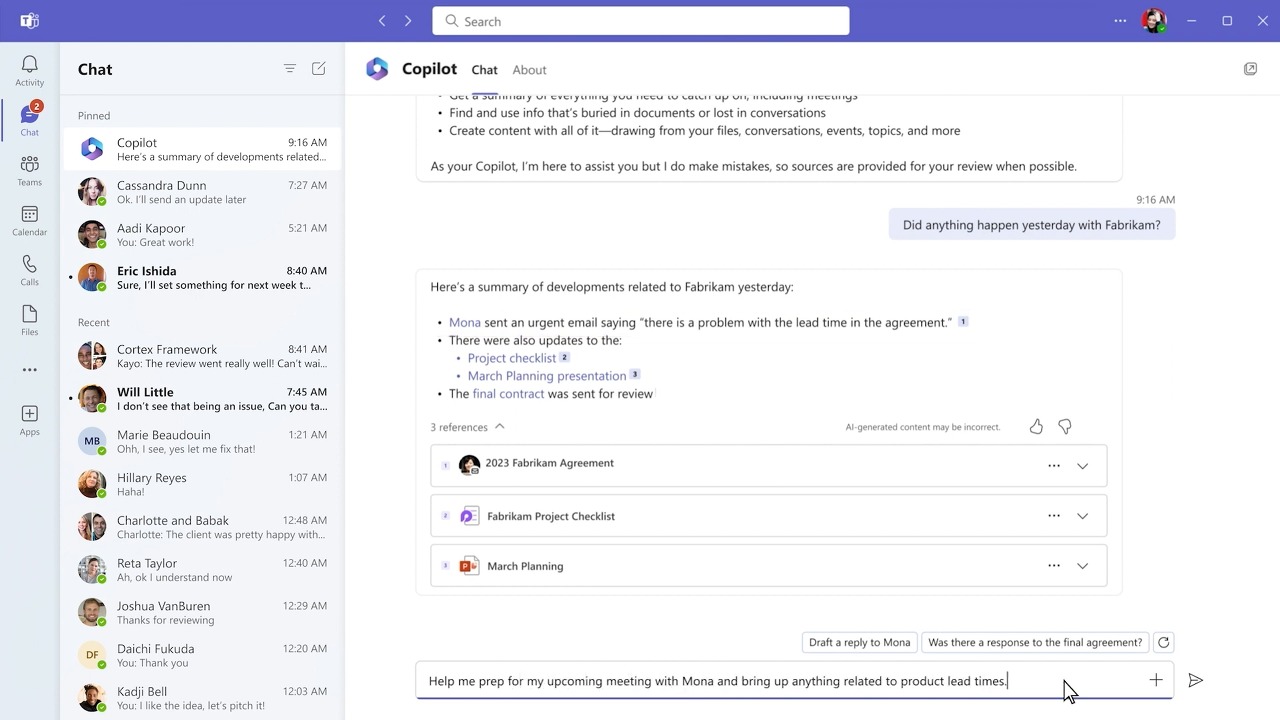 예를 들어 "제품 전략 업데이트를 팀에 공유해주세요"라고 프롬프트를 입력하면 오전에 있었던 회의를 바탕으로 Copilot 이 제품전략에 대해 요약하고 이메일과 팀즈 채팅 목록 등을 바탕으로 필요한 사람들에게 관련 내용을 공유합니다.